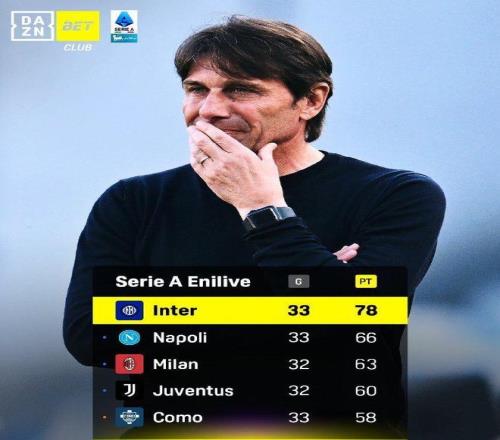 - 意甲悬念终结卫冕冠军2场不胜送礼国米12分领跑下轮或夺第21冠