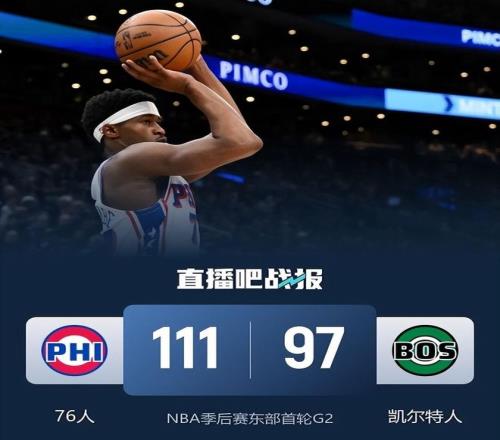 参考资料:懂球帝 76人111-97凯尔特人1-1扳平,埃奇库姆30+10,布朗空砍36分